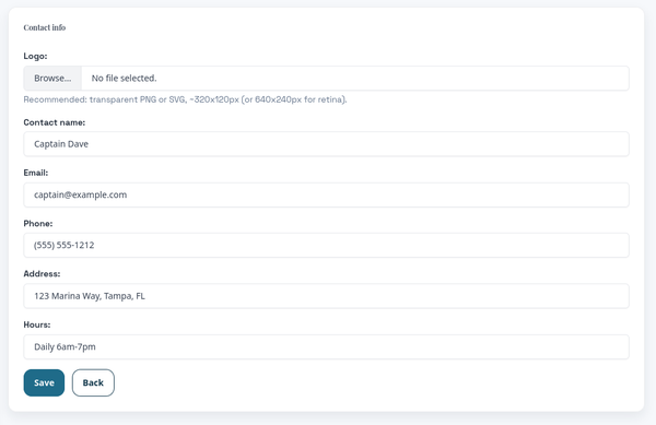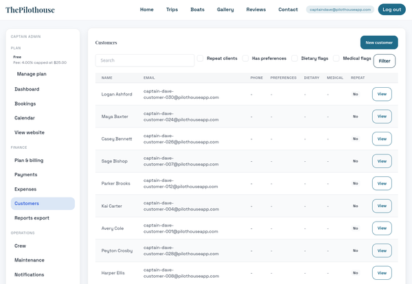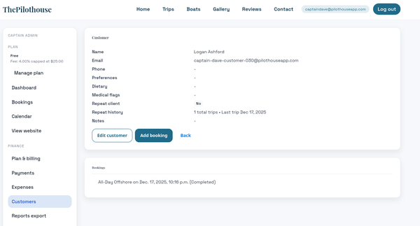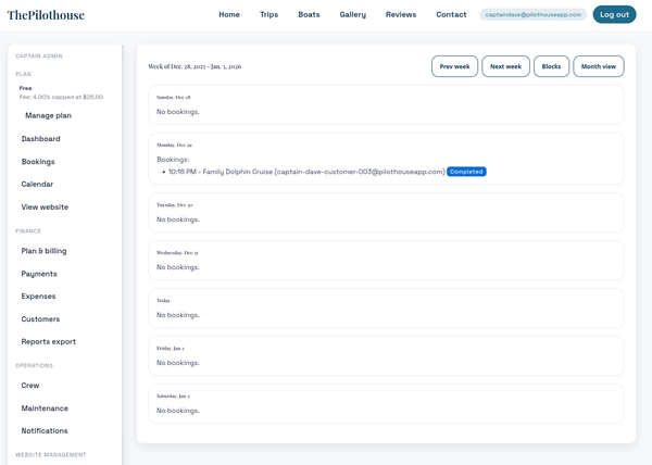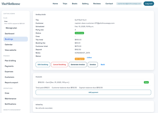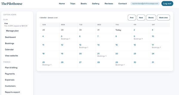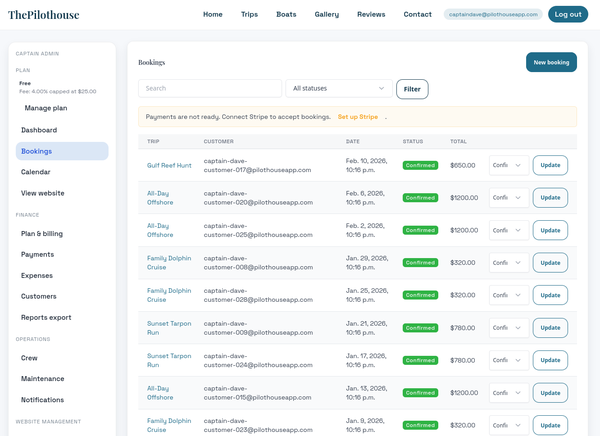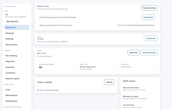 Start with PilotHouse-hosted public pages, automated confirmations, and Stripe-connected deposits. Upgrade to Pro Charter when you need branded-domain hosting and crew tools.