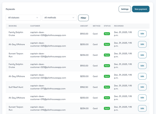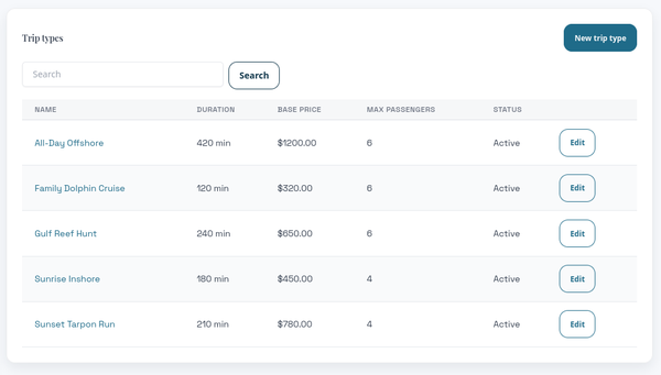 PilotHouse Free gives you a clean booking page with trip options, pricing, and deposit checkout so guests can book without confusion.